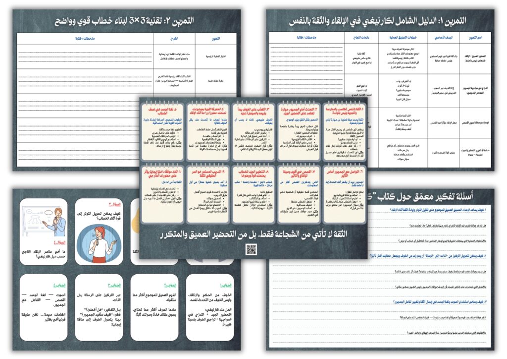 باقة التدريب الخاصة بنا مستوحاة من مبادئ كارنيغي، وتجمع بين ملخصات دقيقة، تمارين عملية، وأسئلة تطبيقية تساعدك على تعزيز ثقتك بنفسك، تحسين أسلوبك في الحديث، وإتقان فن الخطابة خطوة بخطوة. الخيار الأمثل لكل من يسعى إلى تطوير شخصيته، التأثير في الآخرين، والتألق في أي موقف اجتماعي أو مهني، بأسلوب علمي، هادئ، وعملي.